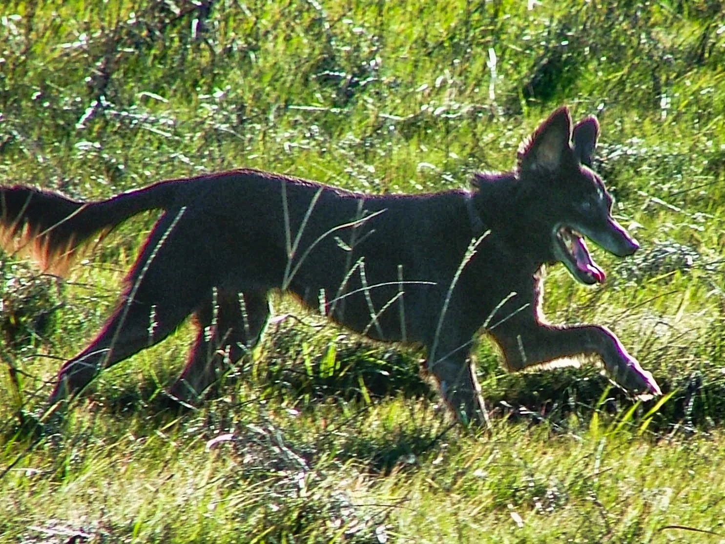 Imagine the sight! As I was racing down on the shovel, I would glance back and see this shaggy black beast bounding again and again. Her ears would fly up as she reached the apex of her leap and would flop down again as she hit the ground. Her eyes were fixed in front of her and her black whip of a tail was set straight behind her as a rudder.